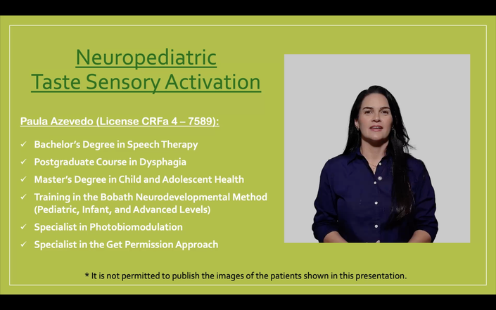 Graduated in the Pediatric Bobath Neurodevelopment Method (Baby and Advanced), in Photobiomodulation, in Gustatory Sensory Stimulation, and in the International Feeding Rehabilitation Method “Get Permission Approach” by Marsha Dunn Klein.